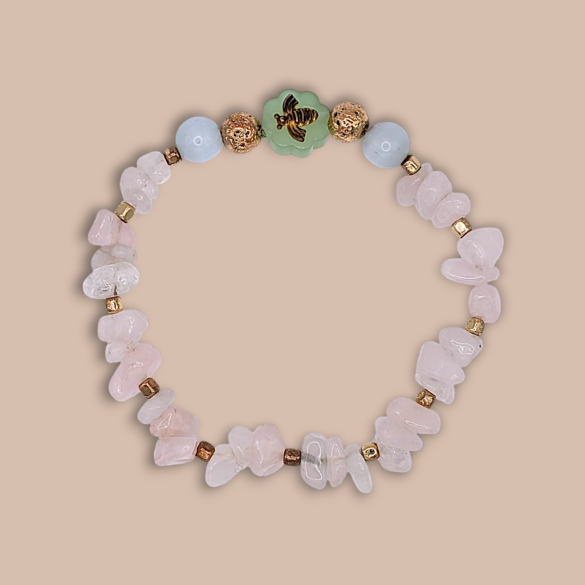 Sweet, soft, and full of light — this bracelet blends the gentle energy of rose quartz chips with the cleansing power of selenite. A carved green accent with a golden bee detail adds a touch of whimsy, making this piece as joyful as it is healing. Perfect for stacking or wearing solo when you need a little reminder of love and clarity.