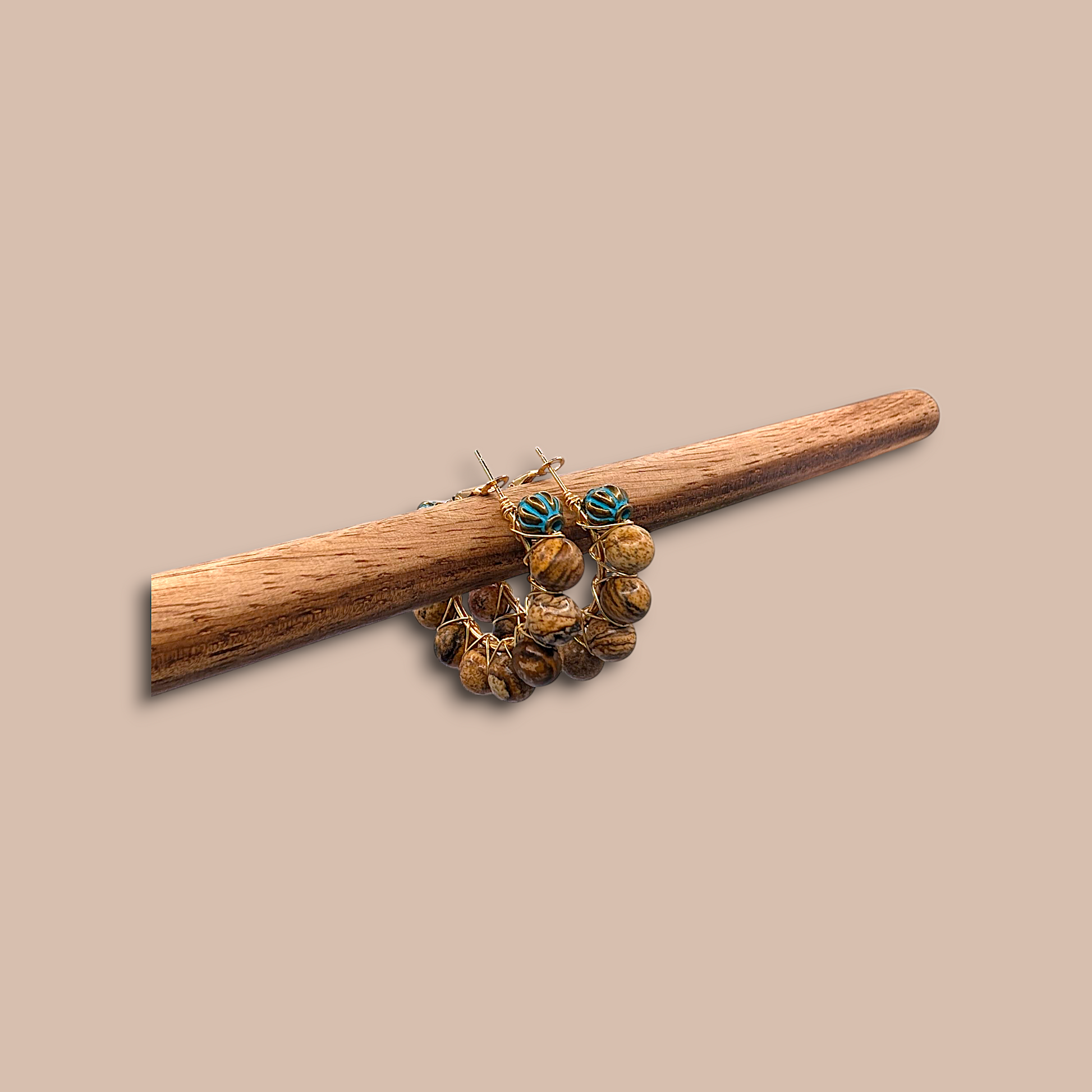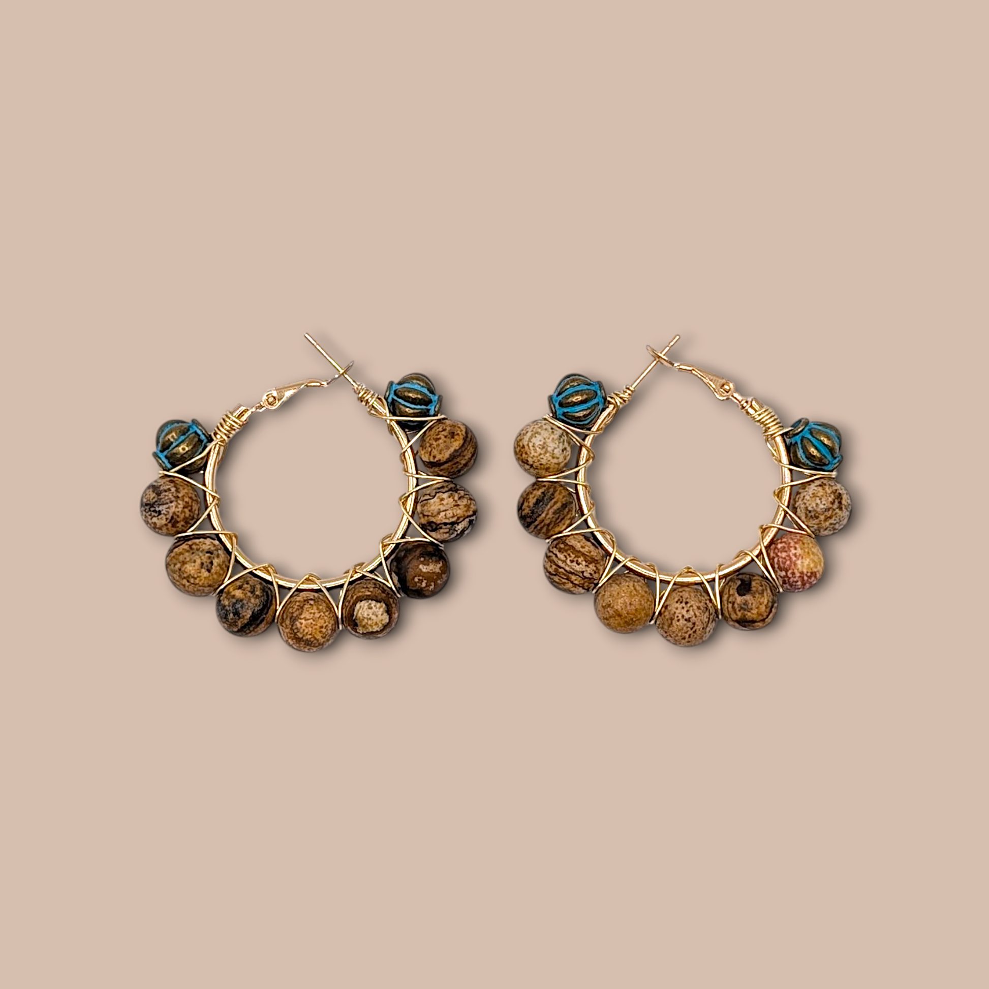 These golden hoops are wrapped with natural Picture Jasper stones—each one featuring warm, grounding patterns that feel like little landscapes. A few colorful accent beads add a fun, stylish touch without overpowering the natural vibe.