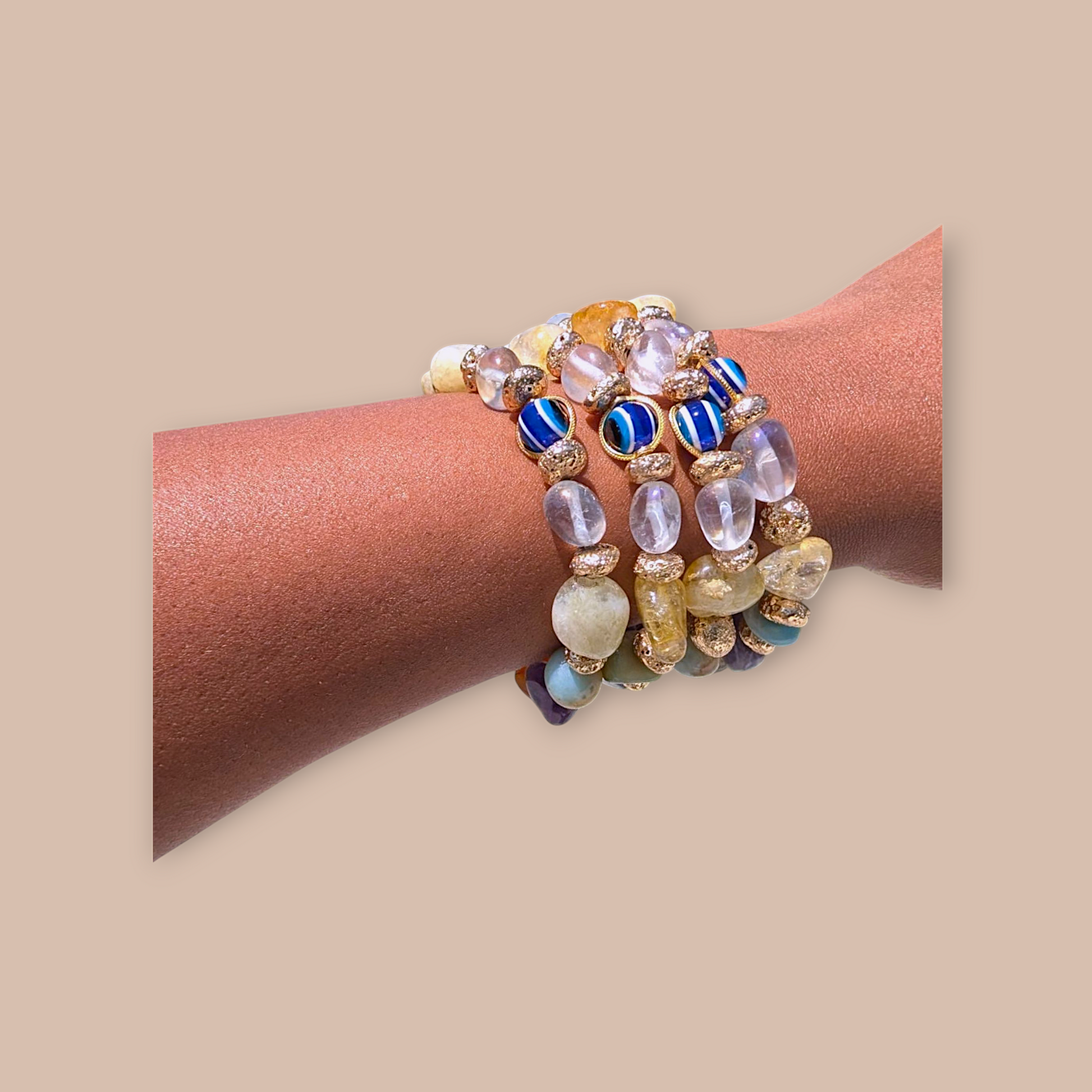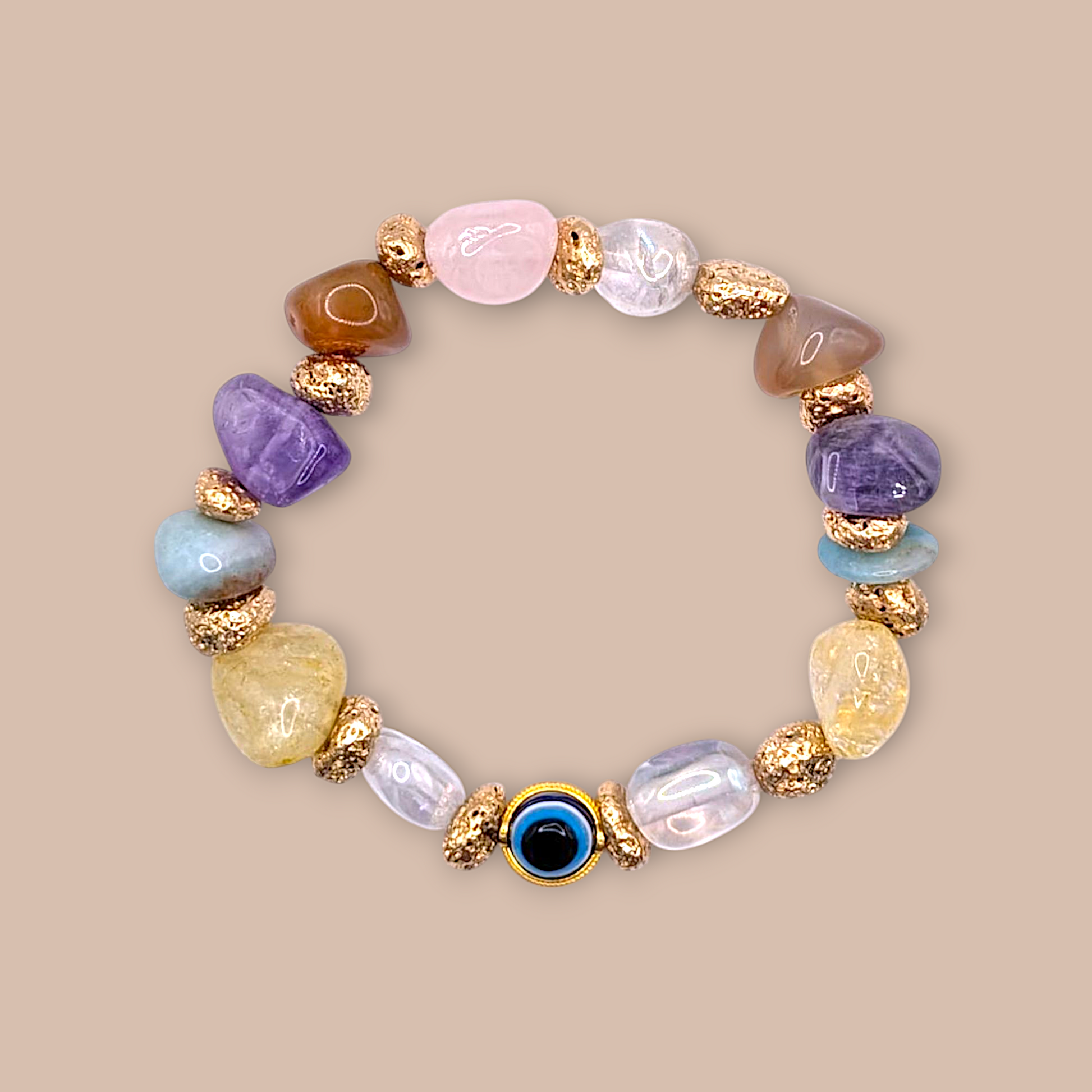 A bold blend of irregular natural gemstones and golden lava stone, this bracelet grounds your energy while adding a touch of earthy elegance. Each stone is unique—just like you—bringing balance, strength, and a hint of golden glow to your everyday vibe.