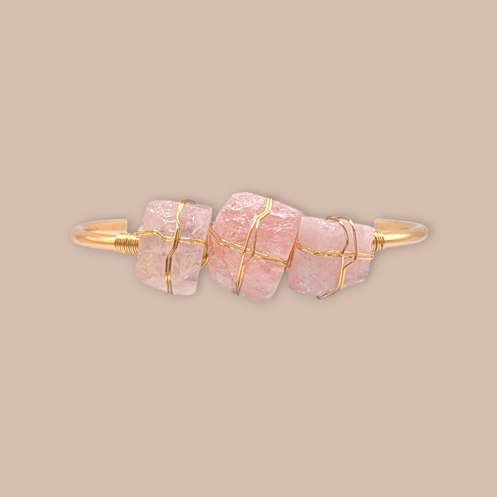 Three rose quartz stones are nestled in raw copper, symbolizing the connection between mind, body, and soul. Known as the stone of unconditional love, rose quartz gently encourages compassion, inner peace, and open-hearted living.